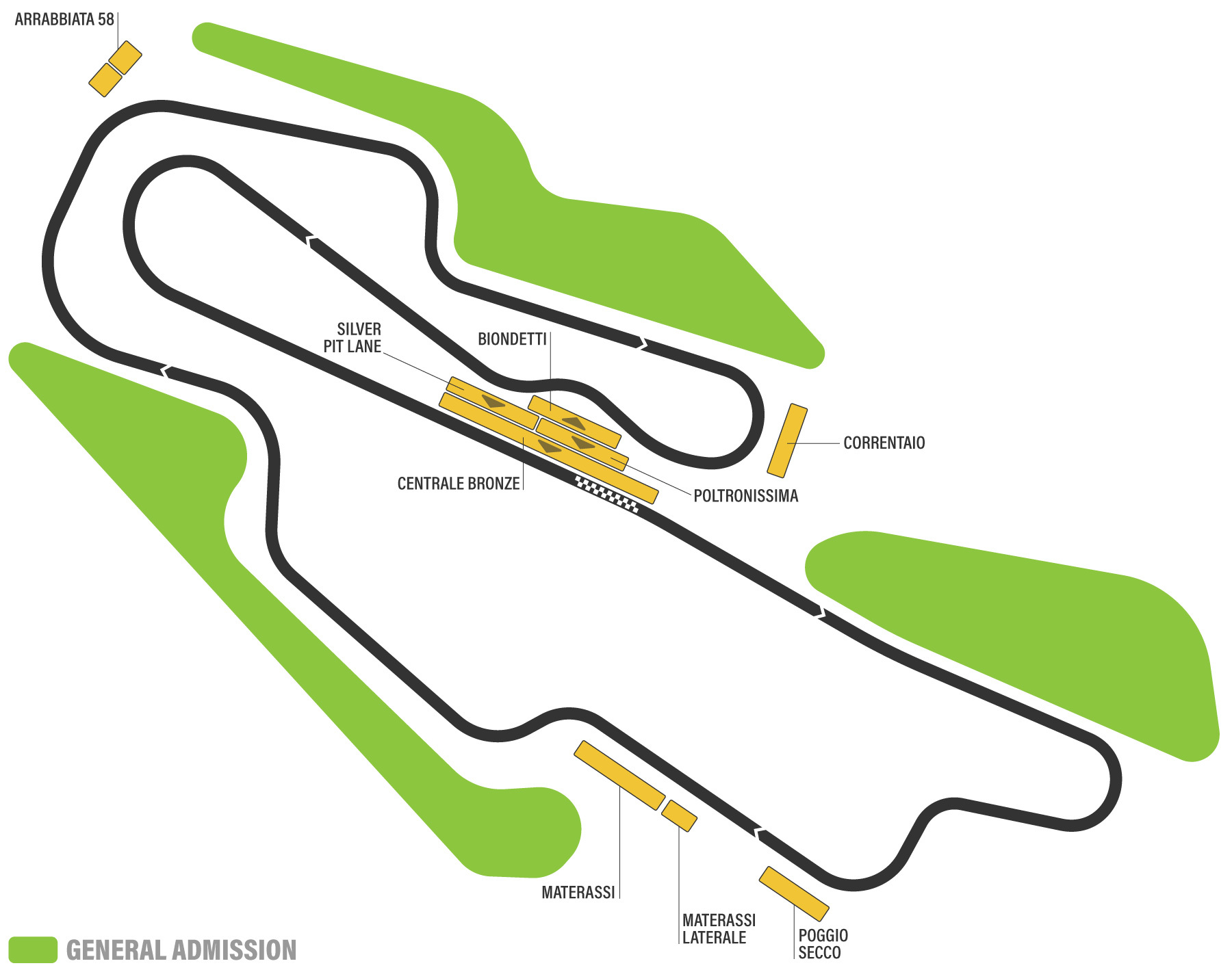 The Correntaio Grandstand is located at the Correntaio corner, offering a fantastic view of the final sections of the track and a close-up look at the riders as they approach the end of each lap.